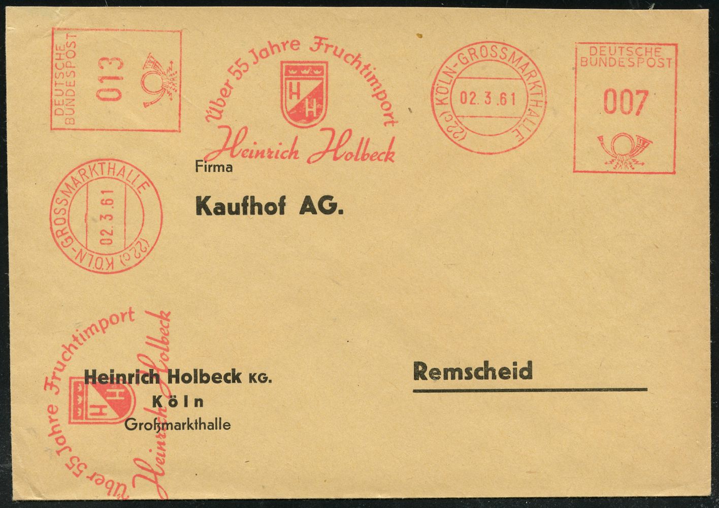 9290 | 18 € | 5000 KÖLN (Absender-Freistempel) : (22c) KÖLN - G R O S S M A R K T H A L L E / Über 55 Jahre Fruchtimport/ Heinrich Holbeck 1961 (2.3.) AFS Francotyp 007 Pf. + 013 Pf., 2 Abdrucke! (Wappen) auf portorichtigem Firmen-Bf.: Heinrich Holbeck KG.. Großmarkthalle n. Remscheid (Dü.E-26) | ![]() | |
