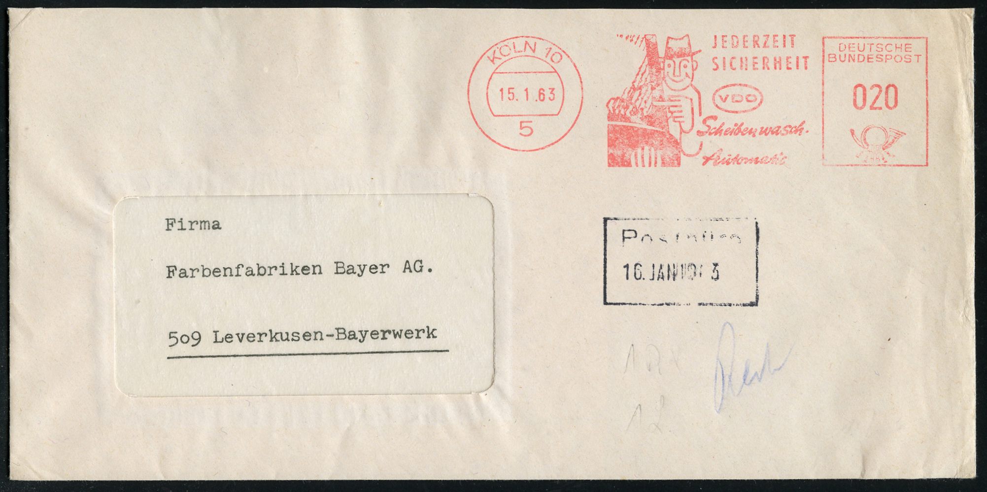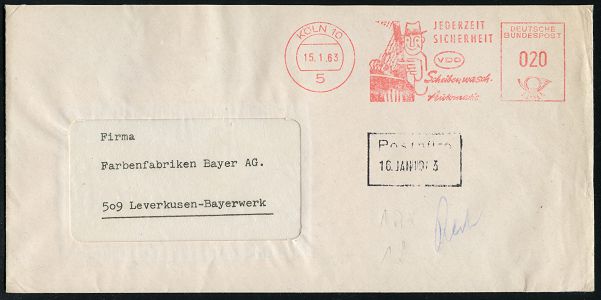 9293 | 14 € | 5000 KÖLN (Absender-Freistempel) : 5 KÖLN 10/ JEDERZEIT/ SICHERHEIT/ VDO/ Scheibenwasch-/ Automatik 1963 (15.1.) AFS Francotyp (Autofahrer bei Regen zeigt auf Frontscheibe) Fern-Bf. (Dü.E-23CO) | ![]() | |