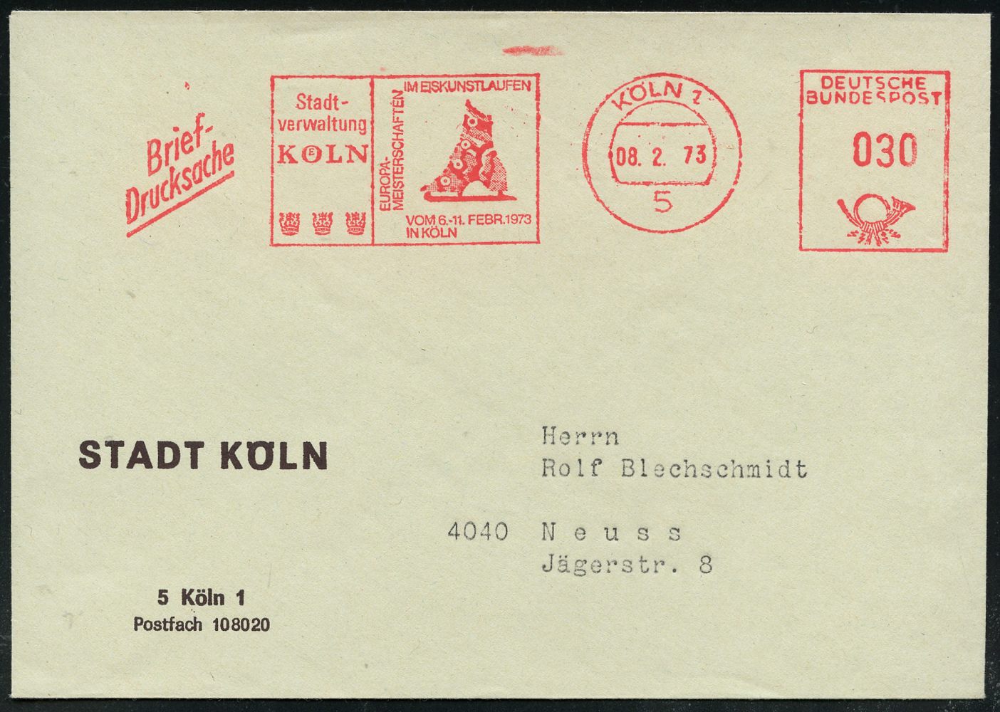 9306 | 18 € | 5000 KÖLN (Absender-Freistempel) : 5 KÖLN 1/ Stadt-/ verwaltung/ EUROPA-/ MEISTERSCHAFTEN/ IM EISKUNSTLAUFEN 1973 (8.2.) AFS Francotyp (= histor. Schlittschuh) klar gest. Kommunal-Bf.: STADT KÖLN (Dü.E-26, nur wenige Wochen verwendet) | ![]() ![]() | |
