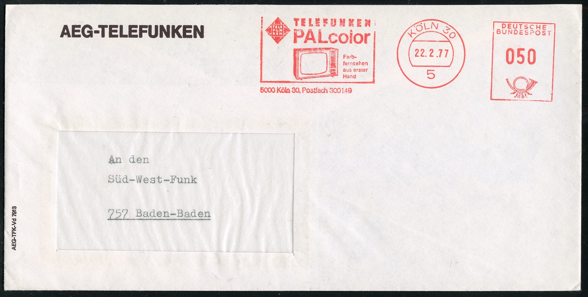 9307 | 12 € | 5000 KÖLN (Absender-Freistempel) : 5 KÖLN 30/ TELEFUNKEN/ PALcolor/ Farb-/ fernsehen.. 1977 (22.2.) AFS Francotyp (Logo, TV-Apparat) klar gest. Firmen-Bf. (Dü.E-26) | ![]() | |