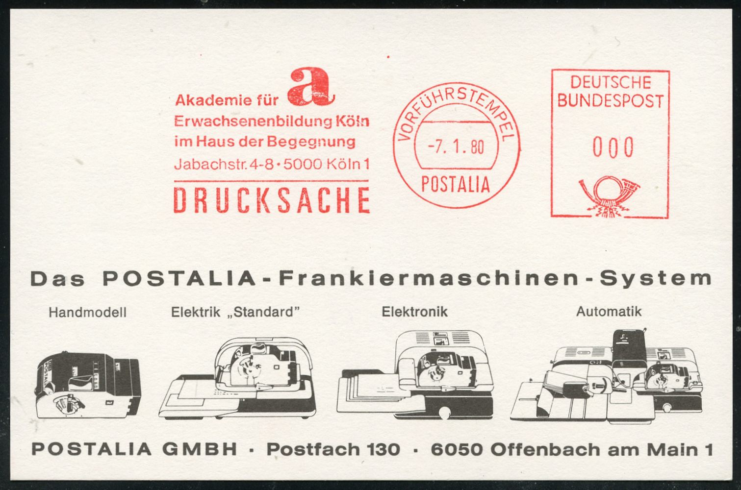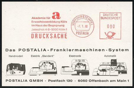 9309 | 16 € | 5000 KÖLN (Absender-Freistempel) : 5000 Köln 1 1980 (7.1.) AFS.: VORFÜHRSTEMPEL/POSTALIA/Akademie für/Erwachsenenbildung Köln.. (Buchstabe "a") seltene Postalia-Musterkt.! (= Specimen) | ![]() | |