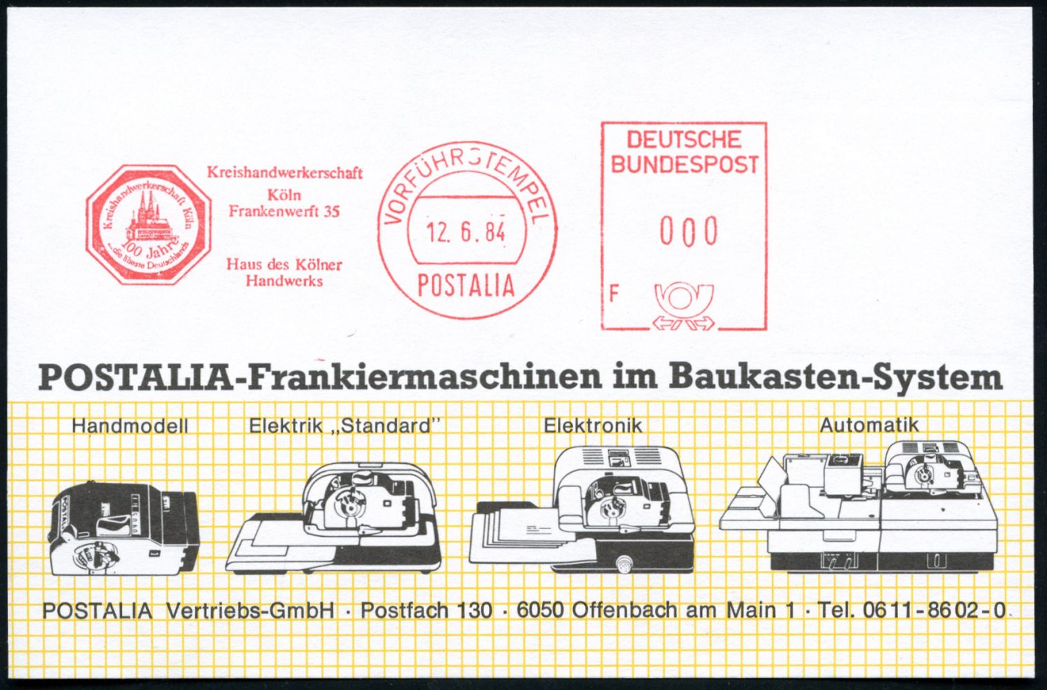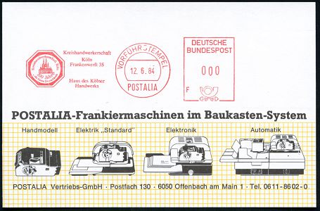 9313 | 16 € | 5000 KÖLN (Absender-Freistempel) : Köln 1984 AFS: VORFÜHRSTEMPEL/POSTALIA/ Kreishandwerkerschaft/ 100 Jahre.. = Logo mit Kölner Dom , seltene Postalia-Musterkt.! (= Specimen) | ![]() | |
