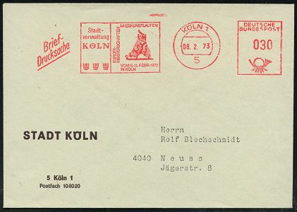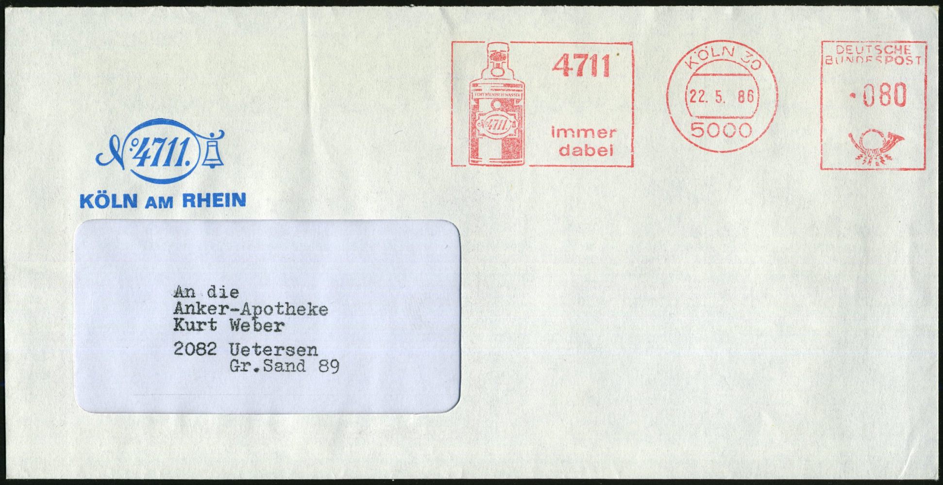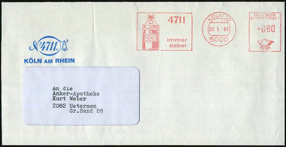 9317 | 10 € | 5000 KÖLN (Absender-Freistempel) : 5000 KÖLN 30/ 4711/ immer/ dabei 1986 (22.5.) AFS Francotyp = "Kölnisch Wasser"-Flasche , Firmen-Bf.: 4711.. (Dü.E-26) | ![]() | |