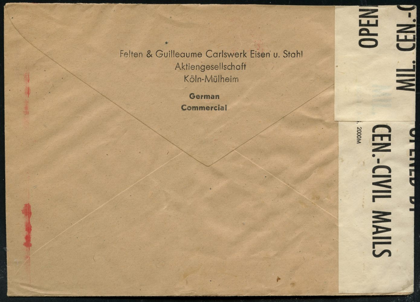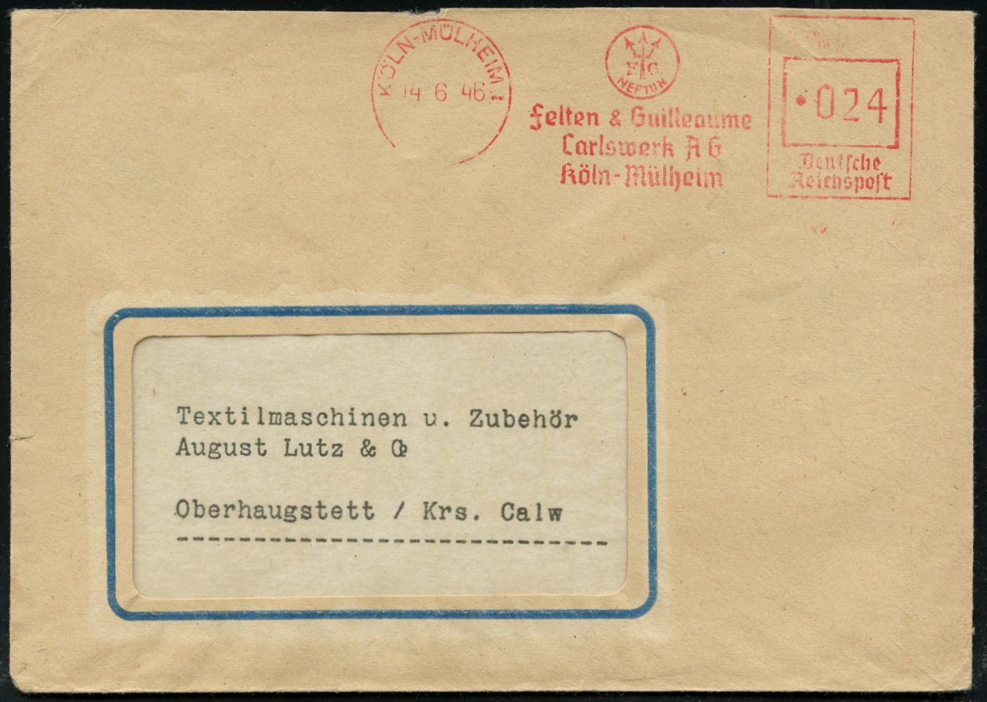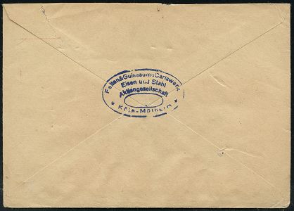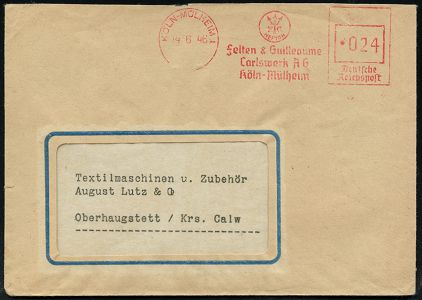 9263 | 25 € | 5000 KÖLN (Absender-Freistempel) : KÖLN-MÜLHEIM 1/ NEPTUN/ Felten & Guilleaume/ Carlswerk AG.. 1946 (14.6.) aptierter AFS Francotyp "Reichsadler" = entfernt = Notmaßnahme! (Firmenlogo Neptuns Dreizack) rs. ovaler Abs.-Oval: ..Eisen u. Stahl AG.., Fern-Bf., vergl. Kat.-Nr. 9201 (Dü.E-13 J-147o) | ![]() ![]() | |