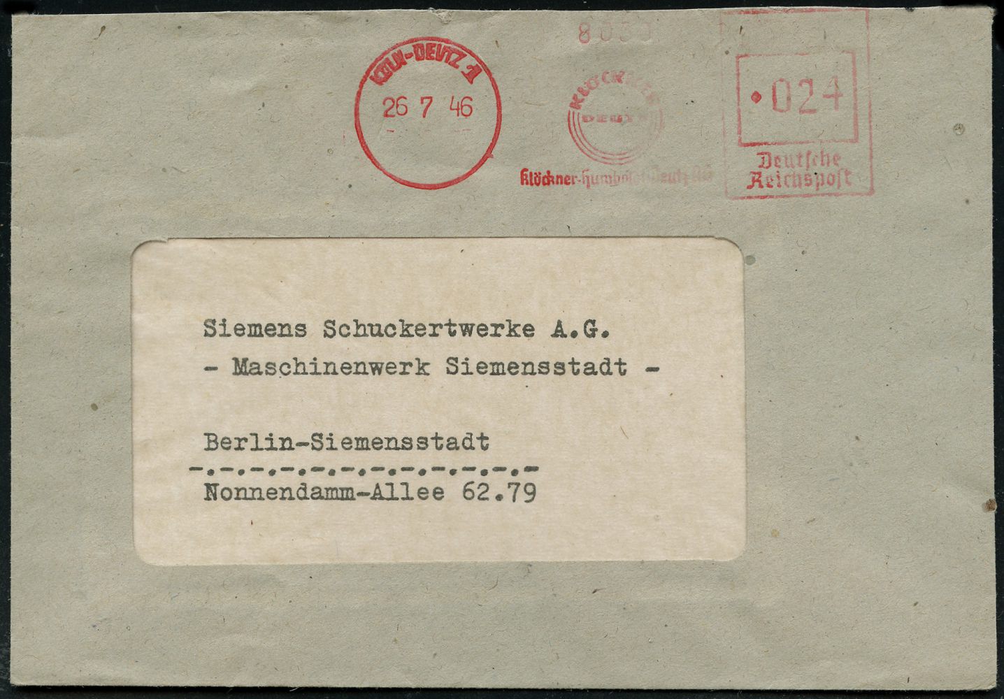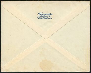 9264 | 25 € | 5000 KÖLN (Absender-Freistempel) : KÖLN-DEUTZ 1/ KLÖCKNER/ DEUTZ/ Klöckner-Humboldt-Deutz 1946 (26.7.) aptierter AFS Francotyp "Reichsadler" = entfernt = Notmaßnahme! (Firmen-Logo = Metall- u. Stahlbetrieb, LKW- u. Motoren-Hersteller etc.) rs. Abs.-Vordruck, Fern-Bf. (Dü.E-13 J-147h) | ![]() | |