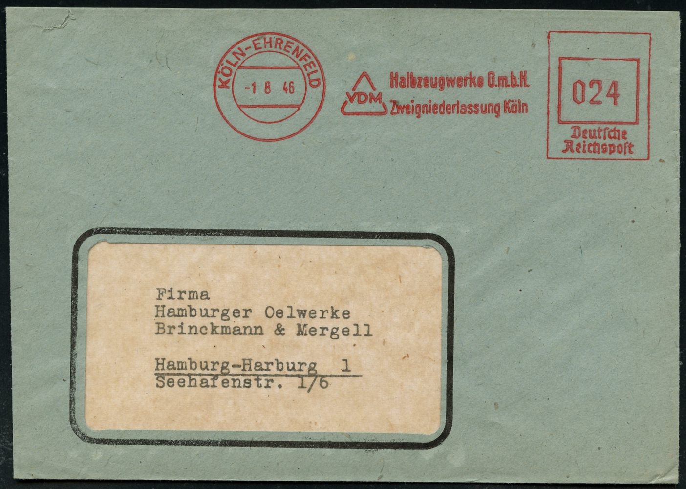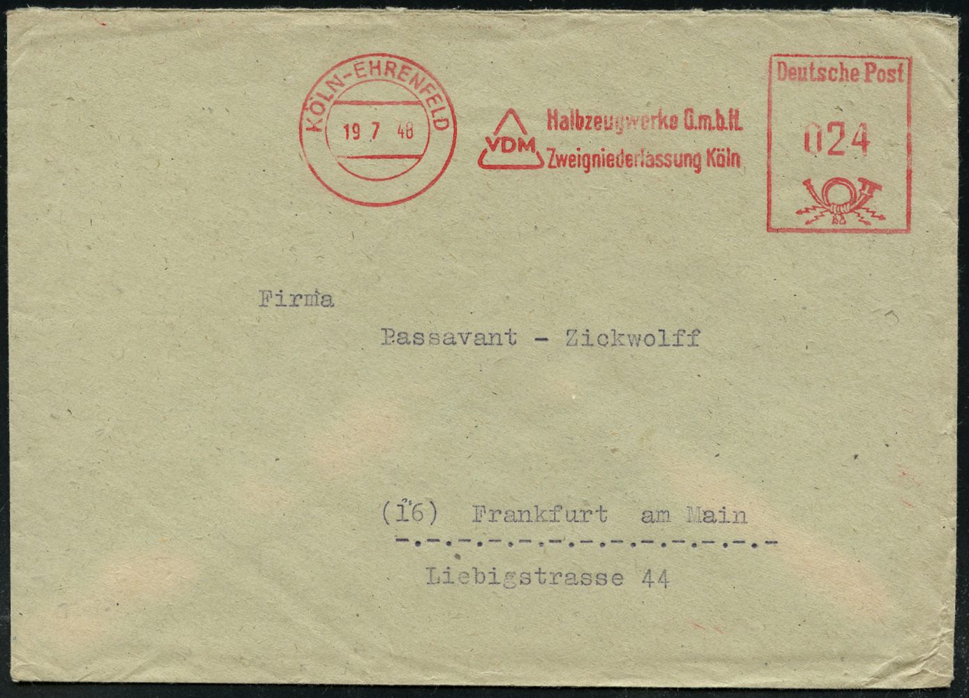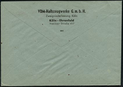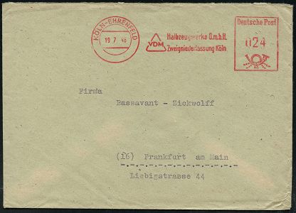 9265 | 35 € | 5000 KÖLN (Absender-Freistempel) : KÖLN-EHRENFELD/ VDM/ Halbzeugwerke GmbH.. 1946/48 aptierter AFS Francotyp "Reichsadler" = entfernt = Notmaßnahme + Nachfolge-AFS "Posthorn" (Deutsche Post) je rs. Abs.-Vordruck, je auf Fern-Bf., 2 Belege (Dü.E-13 J-129o, E-20CGo) | ![]() ![]() ![]() | |