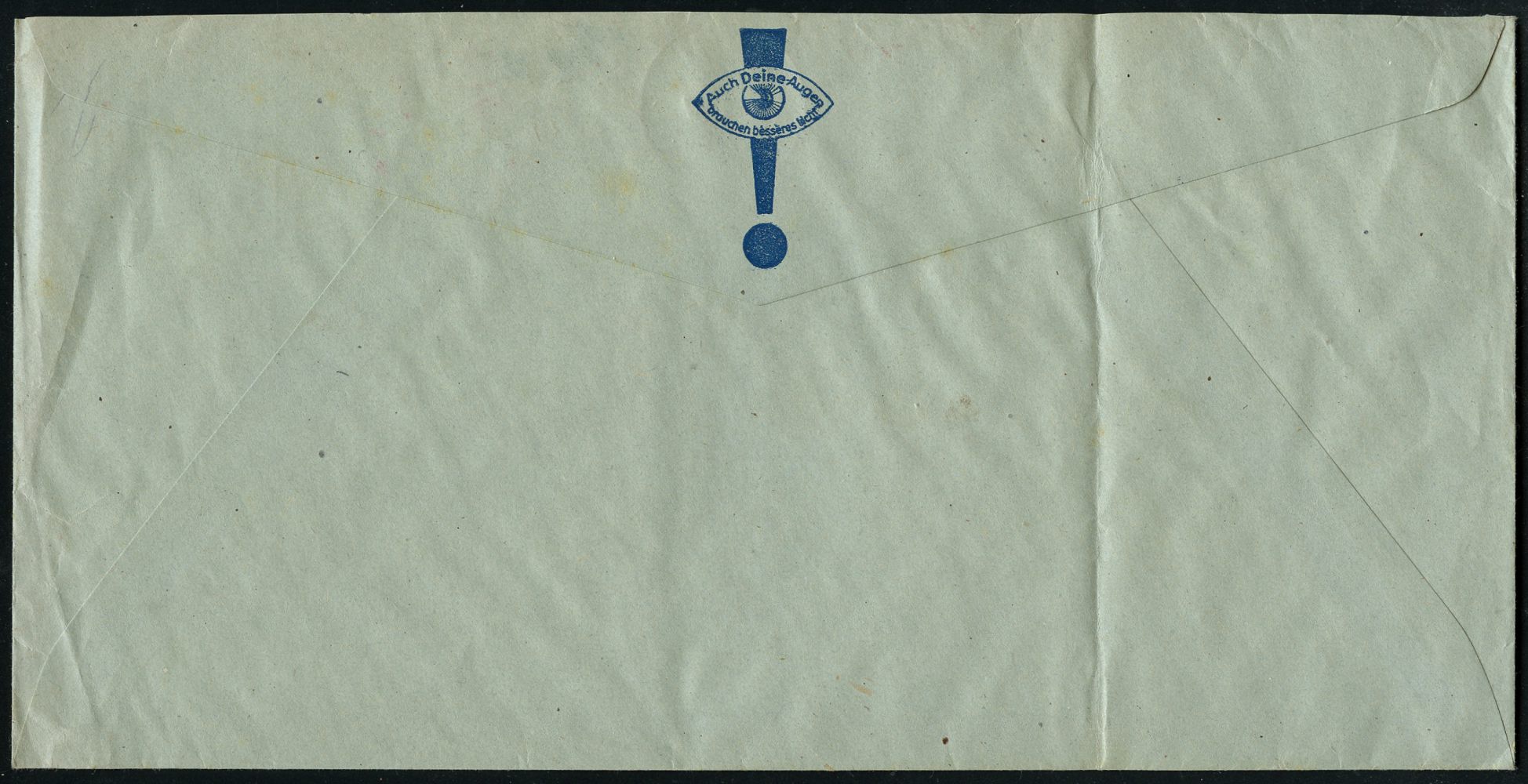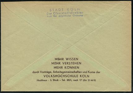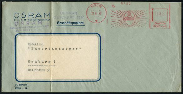 9270 | 22 € | 5000 KÖLN (Absender-Freistempel) : KÖLN/ 1/ OSRAM 1947 (22.8.) aptierter AFS Francotyp "Reichsadler" = entfernt = Notmaßnahme! (Glühbirne), rs. Reklame: Auch Deine Augen braucht besseres Licht (Auge), Firmen-Bf. (links gefaltet) + viol. 3L: OSRAM.. (Dü.E-13 J-129h) | ![]() ![]() | |
