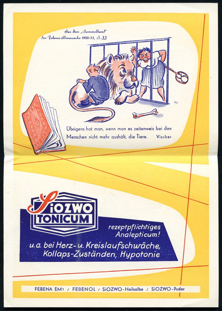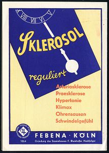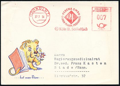9284 | 25 € | 5000 KÖLN (Absender-Freistempel) : (22c) KÖLN 18/ FEBENA GMBH/ FABRIK PHARM.PRÄPARATE.. 1954 (27.7.) AFS Francotyp (astrolog.Zeichen für Jupiter) motivgl. Color-Reklame-Klapp-Kt.: SKLEROSOL.. FEBENA (Uhr, vs. Löwe), seltene Fern-Kt. (Dü.E-23CO) | ![]() ![]() ![]() | |