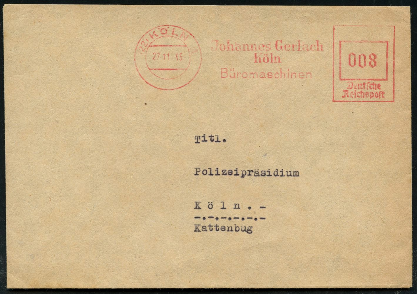 9271 | 25 € | 5000 KÖLN (Absender-Freistempel) : (22) KÖLN 1/ Johannes Gerlach/ ..Büromaschinen 1945 (27.11.) aptierter AFS Francotyp "Reichsadler" = entfernt = Notmaßnahme! , Orts-Bf. an Polizeipräsidium (Dü.E-13 J-129o mit PLZ) | ![]() | |