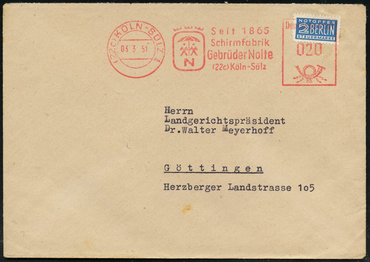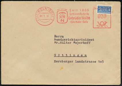 9277 | 16 € | 5000 KÖLN (Absender-Freistempel) : (22c) KÖLN-SÜLZ 1/ Seit 1865/ Schirmfabrik/ Gebr.Nolte.. 1951 (3.3.) AFS Francotyp "Posthorn" (Regenschirm-Logo) auf 2 Pf. NoB = Vorausentwertung, rs. Abs.-Vordruck, Fern-Bf. (Dü.E-20CGo) | ![]() | |