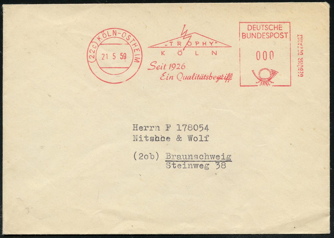 9289 | 14 € | 5000 KÖLN (Absender-Freistempel) : (22c) KÖLN-OSTHEIM/ "TROPHY"/ ..Seit 1926/ Ein Qualitätsbegriff 1959 (21.5.) AFS Postalia "GEBÜHR BEZAHLT", vorschriftsmäßig in 000 = Massen-Drs.! (Blitz u. Dreieck) Inl.-Bf. (Dü.E-23 B) | ![]() ![]() | |