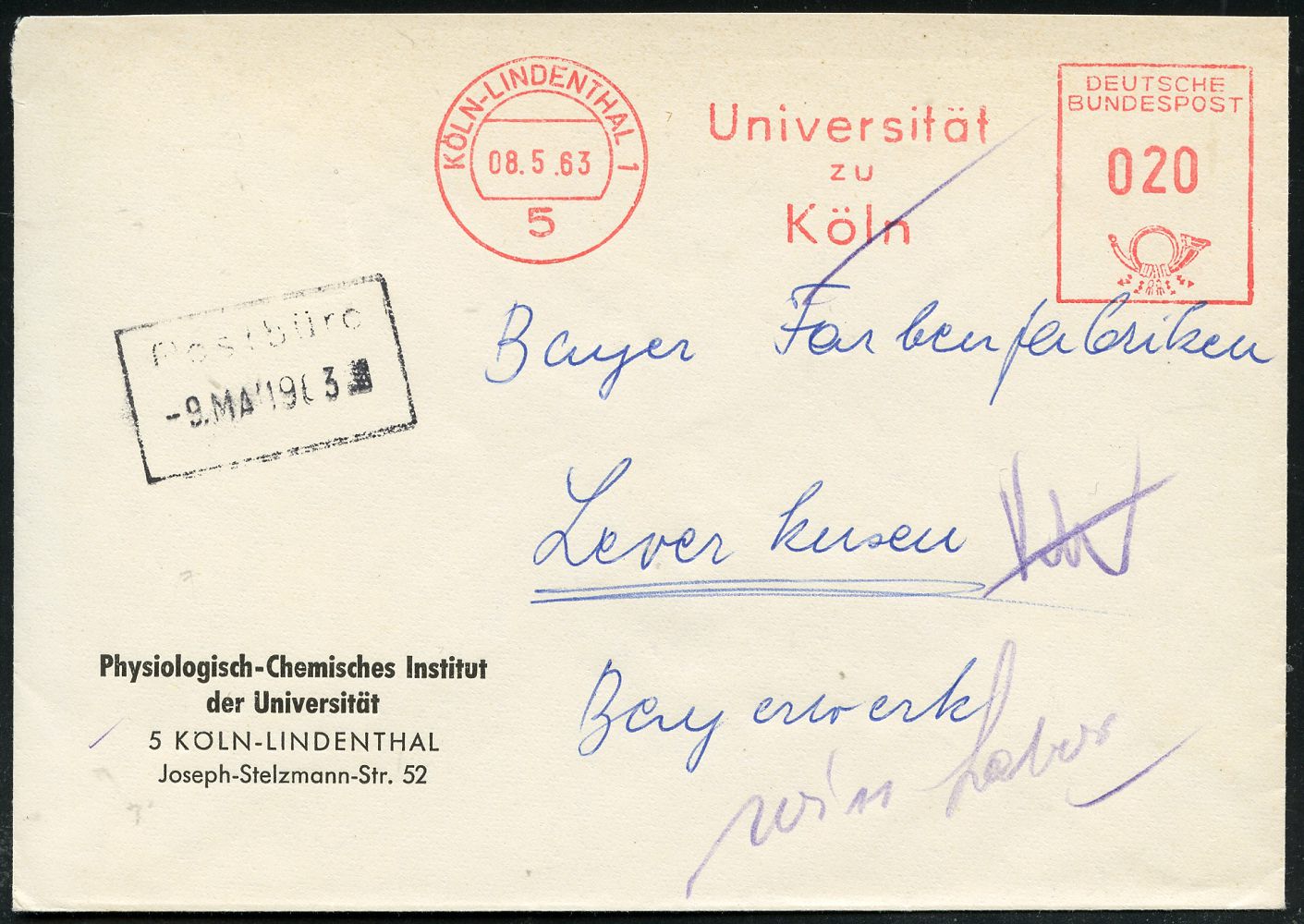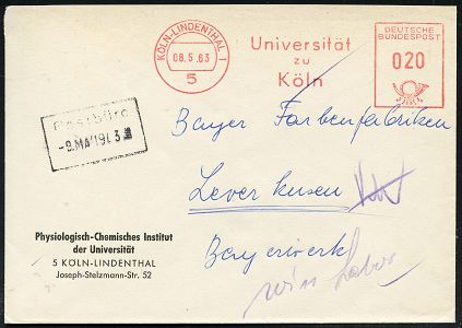 9296 | 12 € | 5000 KÖLN (Absender-Freistempel) : 5 KÖLN-LINDENTHAL 1/ Universität/ zu/ Köln 1963 (8.5.) AFS Francotyp auf Dienst-Bf.: Physiologisch-Chemisches Institut.. (Dü.E-23CO) | ![]() | |