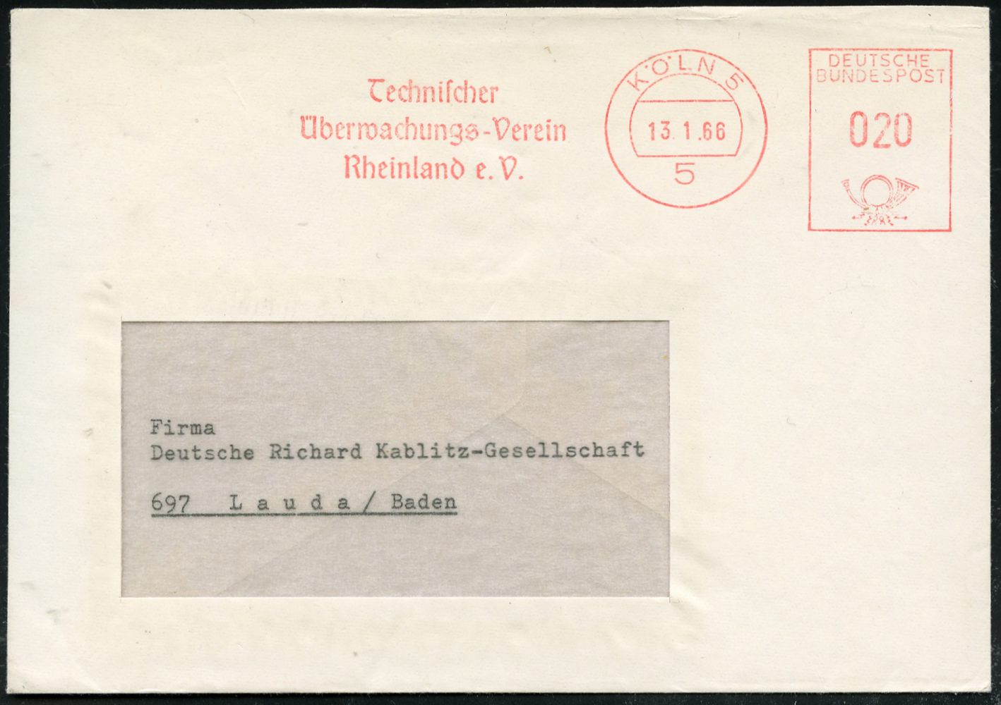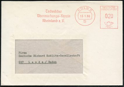 9299 | 12 € | 5000 KÖLN (Absender-Freistempel) : 5 KÖLN 5/ Technischer/ Überwachungs-Verein/ Rheinland e.V. 1966 (13.1.) AFS Francotyp , rs. Abs.-Vordruck, Fern-Bf. (Dü.E-26) | ![]() | |