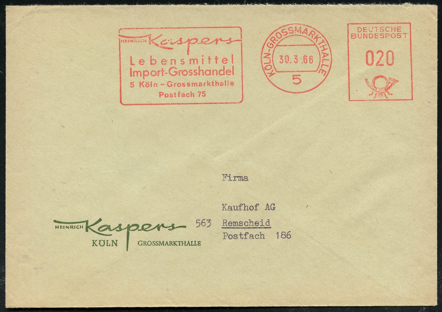 9300 | 15 € | 5000 KÖLN (Absender-Freistempel) : 5 KÖLN-GROSSMARKTHALLE/ HEINRICH Kaspers/ Lebensmittel/ Import-Grosshandel.. 1966 (30.3.) AFS Francotyp auf Firmen-Fern-Bf. (Dü.E-26) | ![]() | |