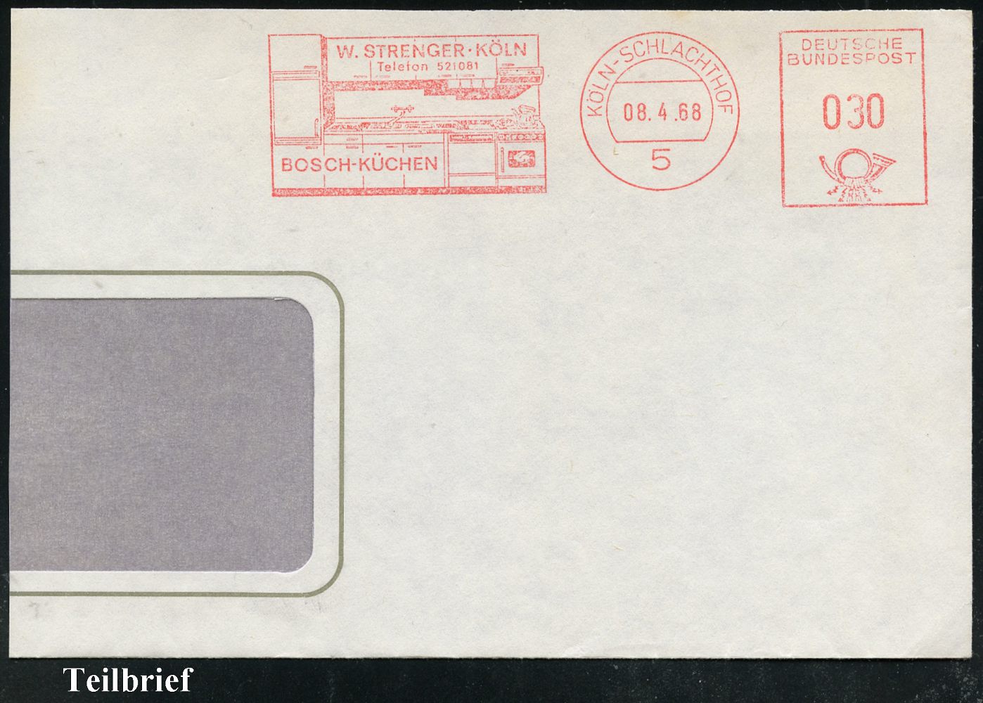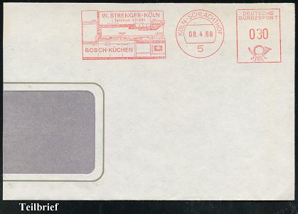 9303 | 12 € | 5000 KÖLN (Absender-Freistempel) : 5 KÖLN- S C H L A C H T H O F / W.STRENGER../ BOSCH-KÜCHEN 1968 (8.4.) AFS Francotyp (Küchenzeile) Teil-Bf. (Dü.E-26) | ![]() | |