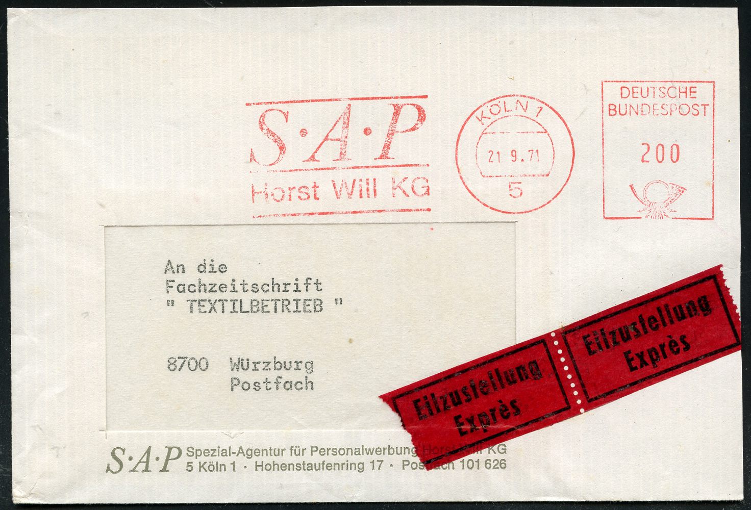 9305 | 16 € | 5000 KÖLN (Absender-Freistempel) : 5 KÖLN 1/ S-A-P/ Horst Will KG 1971 (21.9.) AFS Postalia 200 Pf. auf Firmen-Fern-Eil-Bf.: S.A.P. Spezial-Agentur für Personalwerbung.. n. Würzburg, rs. AS. (Dü.E-26 B) | ![]() ![]() | |