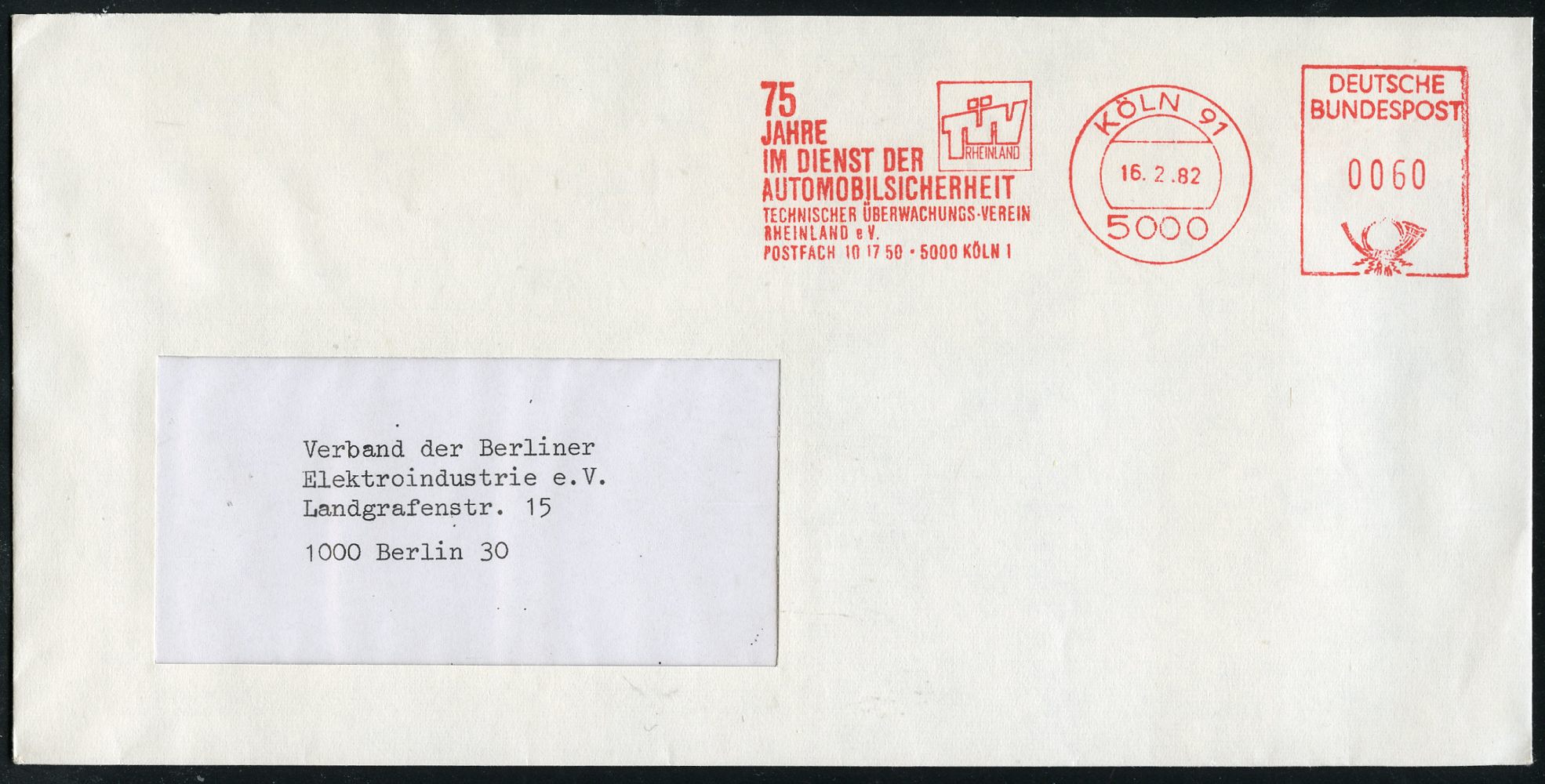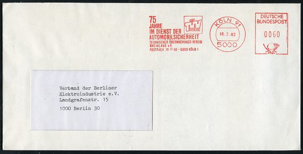 9310 | 12 € | 5000 KÖLN (Absender-Freistempel) : 5000 KÖLN 91/ 75/ JAHRE/ IM DIENST DER/ AUTOMOBILSICHERHEIT/ TECHN.ÜBERWACHUNGS-VEREIN/ RHEINLAND.. 1982 (16.2.) Jubil.-AFS Postalia, vierstellin 0060 Pf. , Fern-Bf., vergl. Kat.-Nr. 9308 (Dü.E-26 B) | ![]() ![]() | |