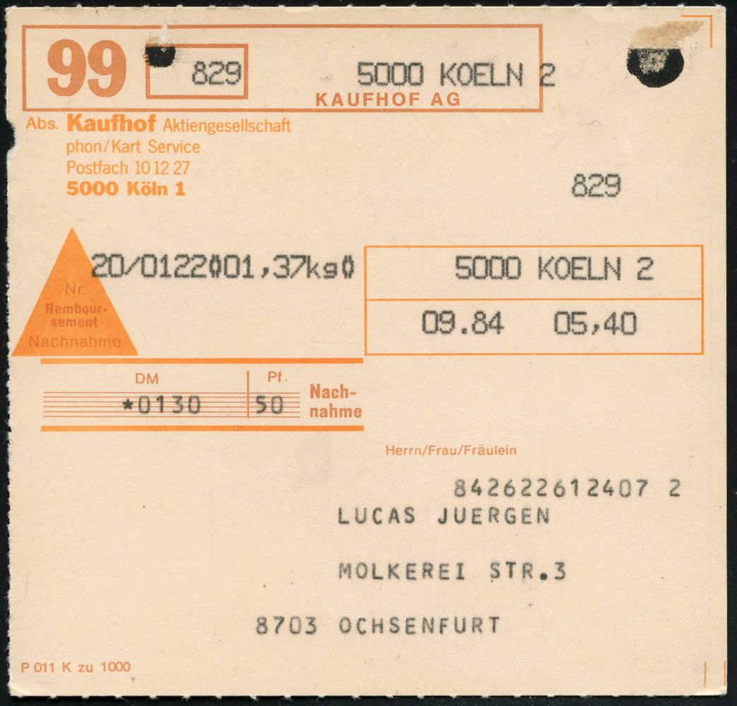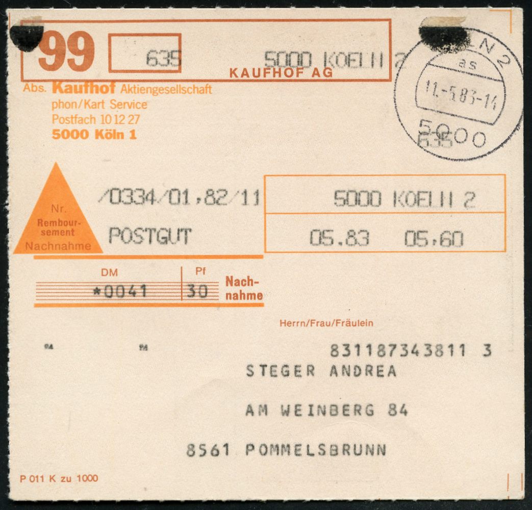 9312 | 12 € | 5000 KÖLN (Absender-Freistempel) : 5000 KOELN 2 1983 (11.5.) EDV-Freistempel der Fa. Kaufhof ohne Tagesziffer 03,90 (DM) zweizeilig mit Zusatz "POSTGUT"+ 1K-Segment: 5000 KÖLN 2/as , Inl.-NN-Selbstbucher-Paketkarte: KAUFHOF AG.. n. Pommelsbrunn | ![]() | |