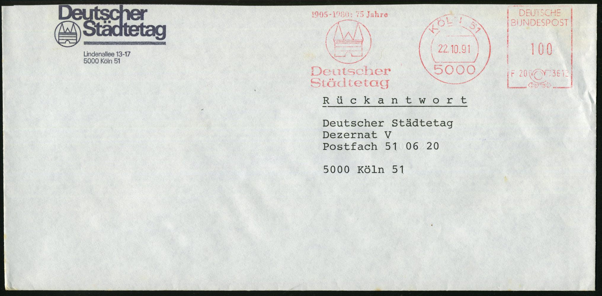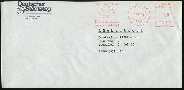 9318 | 10 € | 5000 KÖLN (Absender-Freistempel) : 5000 KÖLN 51/ F20 3612/ 1905-1980:75 Jahre/ Deutscher/ Städtetag 1991 (22.10.) seltener Jubil.-AFS Postalia mit Kennung = Holstentor (Kiel) motivgl. Kommunal-Bf. (Dü.E-26B) | ![]() | |