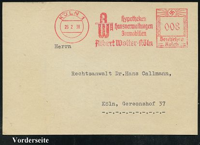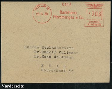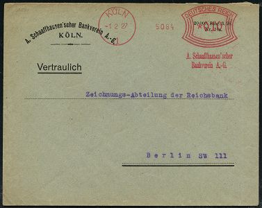 9233 | 25 € | 5000 KÖLN (Absender-Freistempel) : KÖLN 1/ Bankhaus/ Pferdmenges & Co. 1938 (23.6.) AFS Francotyp "Reichsadler" auf Bedarfs-Vorderseite, die Fa. Pferdmenges profitierte von der "Arisierung" der jüdischen Bank Sal. Oppenheim im Jahr der anti-jüdischen Progrome, vergl. Kat.-Nr. 9112 (Dü.E-5DGh) | ![]() | |