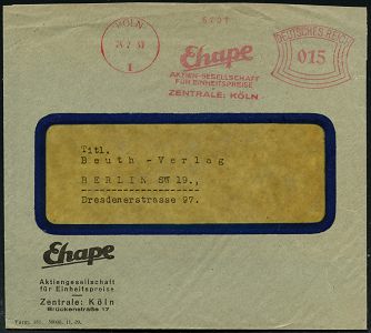 9116 | 25 € | 5000 KÖLN (Absender-Freistempel) : KÖLN/ 1/ Ehape/ AG/ FÜR EINHEITSPREISE/ ZENTRALE KÖLN 1930 (24.2.) AFS Francotyp "Bogenrechteck" , klar gest. Firmen-Bf.: Ehape AG für Einheitspreise... (Dü.E-1CAh) | ![]() ![]() | |