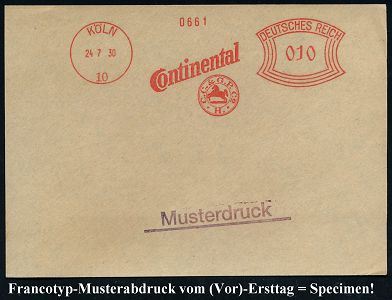 9117 | 35 € | 5000 KÖLN (Absender-Freistempel) : KÖLN/ 10/ Continental/ C.C. & G.P. Co./ H. 1930 (24.7.) AFS-Musterabdruck Francotyp "Bogenrechteck" (Firmenlogo mit Pferd) = Reifen- u. Autotechnik-Hersteller, glasklar gest. Francotyp-Musterblatt vom V o r - Ersttag!, selten! (Dü.E-1CEh) | ![]() ![]() | |