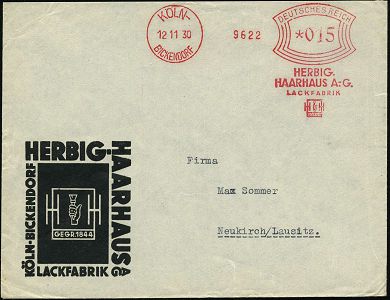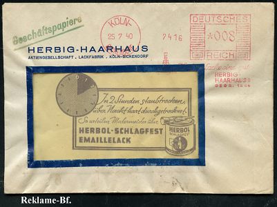 9253 | 25 € | 5000 KÖLN (Absender-Freistempel) : KÖLN-/ BICKENDORF/ Herbig-Lacke sind gut!/ HERBIG-/ HAARHAUS AG/ GEGR,1844 1940 (25.7.) AFS Francotyp "Mäanderrechteck" (Logo: Hand mit Pinsel) auf Reklame-Bf.: HERBOL-SCHLAGFEST EMAILLELACK, rs. motivgl. Firmen-Logo (Dü.E-2Am) | ![]() ![]() | |