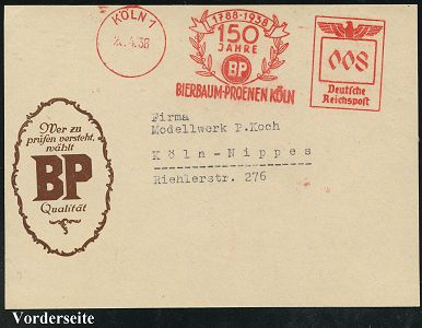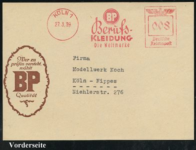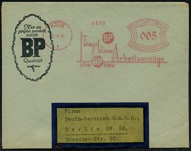 9123 | 20 € | 5000 KÖLN (Absender-Freistempel) : KÖLN/ 1/ BP/ Trage/ blaue/ Arbeitsanzüge/ Gold BP Silber 1931 (26.3.) AFS Francotyp "Bogenrechteck" (Monogr.-Logo) auf (unten etw. verkürztem) Firmen-Bf., rs. Abs.-Vordruck: Bierbaum-Proenen (Dü.E-1BAh) | ![]() ![]() | |