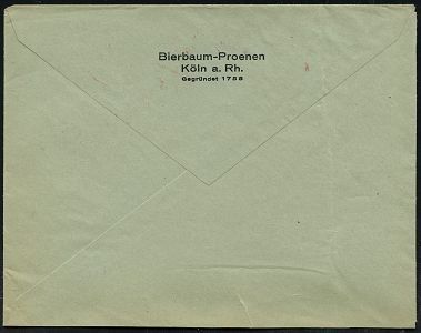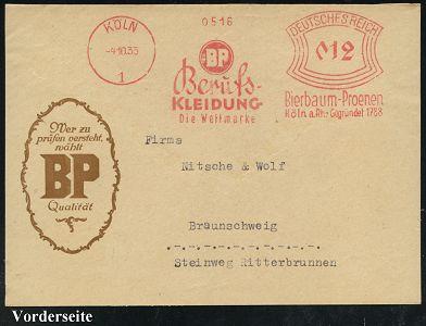 9144 | 30 € | 5000 KÖLN (Absender-Freistempel) : KÖLN 1/ BP/ Berufs-/ KLEIDUNG/ ..Bierbaum-Proenen.. 1933/39 3 verschiedene AFS Francotyp "Bogenrechteck" bzw. "Reichsadler", dabei Jubiläums-AFS "150 JAHRE 1788 - 1938.." (je Monogr.-Logo) je auf motivgl. Bedarfs-Vorderseite, 3 Belege, vergl. Kat.-Nr. 9123 (Dü.E-1BAh, E-5BAo 2x) | ![]() ![]() ![]() | |