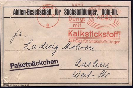 9131 | 28 € | 5000 KÖLN (Absender-Freistempel) : KÖLN/ 4/ Düngt/ mit/ Kalkstickstoff!/ Akt.-Ges. für Stickstoffdünger 1932 (14.3.) AFS Francotyp "Bogenrechteck" 040 Pf. auf Adreß-Label "Paketpäckchen" n. Aachen = seltene Portostufe! (Dü.E-1Ah) | ![]() | |