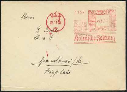 9140 | 20 € | 5000 KÖLN (Absender-Freistempel) : KÖLN/ 7/ POLITIK/ WIRTSCHAFT/ KULTUR/ Kölnische Zeitung 1932 (27.11.) AFS Francotyp "Mäanderrechteck" aus der Zeit Adenauers als Oberbürgermeister (kurz vor dem Ende der Weimarer Republik) Inl.-Bf., die Zeitung wurde nach 1933 gleichgeschaltet, vergl. Kat.-Nr. 9125, 9135 (Dü.E-2Ah) | ![]() | |