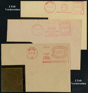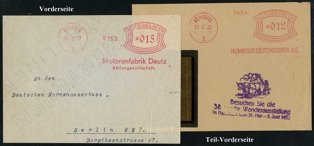 9107 | 40 € | 5000 KÖLN (Absender-Freistempel) : KÖLN-DEUTZ 1/ HUMBOLDT-DEUTZMOTOREN AG... 1927/42 5 verschiedene AFS Francotyp "Bogenrechteck" (3), "Hakenkreuz" und "Reichsadler" (1x teils Sütterlin) 5 Firmen- Vorderseiten bzw. Teil-Vorderseiten, 5 Belege (Dü.E-1Am, E-3Ah, E-5AG) | ![]() ![]() | |