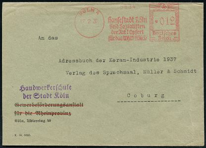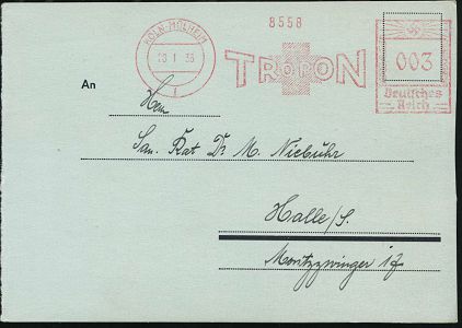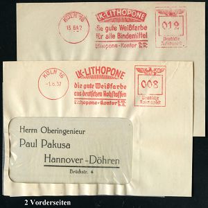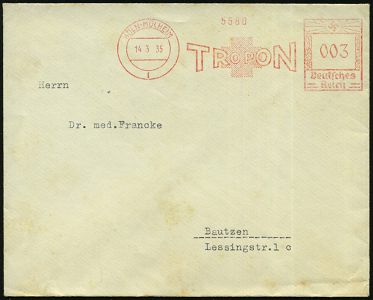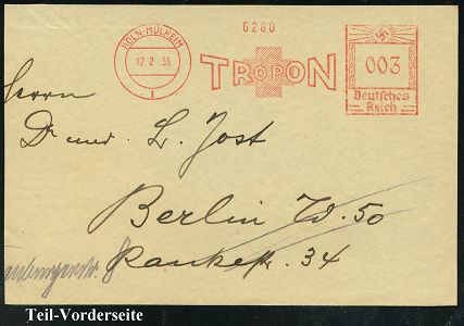 9164 | 16 € | 5000 KÖLN (Absender-Freistempel) : KÖLN-MÜLHEIM/ 1/ TROPON 1935 (14.3.) AFS Francotyp "Hakenkreuz" , rs. Abs.-Vordr.: Troponwerke Dinklage & Co, Fernbf. (schwache Fleckchen) n. Bautzen (Dü.E-3CEh) | ![]() ![]() | |