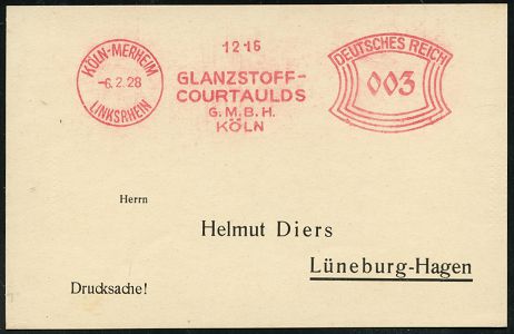 9108 | 18 € | 5000 KÖLN (Absender-Freistempel) : KÖLN-MERHEIM/ LINKSRHEIN/ GLANZSTOFF-/ COURTAULDS/ GMBH.. 1928 (6.2.) AFS Francotyp "Bogenrechteck" klar auf Inl.-Drs.-Karte, Kölns Oberbürgermeister Konrad Adenauer verlor 1928 einen großen Teil seines Vermögens durch Spekulation mit Glanzstoff-Aktien, die stark an Wert veroren! (Dü.E-1BAh) | ![]() ![]() | |