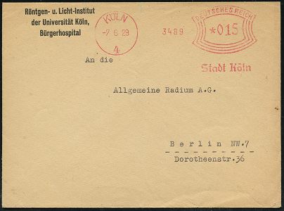 9110 | 20 € | 5000 KÖLN (Absender-Freistempel) : KÖLN/ 4/ Stadt Köln 1929 (7.6.) AFS Francotyp "Bogenrechteck" auf kommunalem Dienst-Bf.: Röntgen- u. Licht-Institut der Universität Köln, Bürgerhospital (rs. kl. Klappenfehler) Konrad Adenauer war Oberbürgermeister von Kön 1917 - 1933 (Dü.E-1Am) | ![]() ![]() | |