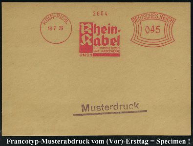 9111 | 35 € | 5000 KÖLN (Absender-Freistempel) : KÖLN-RIEHL/ Rhein-Kabel/ RHEINISCHE DRAHT-/ U.KABELWERKE/ GMBH 1929 (19.7.) AFS-Musterabdruck Francotyp "Bogenrechteck" , glasklar gest. Francotyp-Musterblatt vom (Vor)-Ersttag !, selten! (Dü.E-1CEh = frühe C-Maschine !) | ![]() ![]() | |
