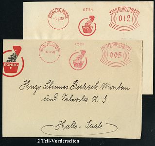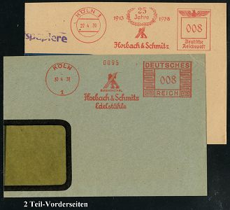 9231 | 25 € | 5000 KÖLN (Absender-Freistempel) : KÖLN 1/ HORBACHSTAHL/ Horbach & Schmitz/ Edelstähle #bzw.# 25 Jahre/ Horbach & Schmitz 1938/39 2 verschiedene AFS Francotyp "Mäanderrechteck" bzw. "Reichsadler" (je Firmenlogo: Figur mit Stahlschiene) je auf Teil-Vorderseite, 2 Belege, vergl. Kat.-Nr. 9232 (Dü.E-2CEh, E-5CEo) | ![]() | |