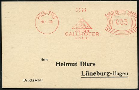 9115 | 18 € | 5000 KÖLN (Absender-Freistempel) : KÖLN-SÜLZ/ AG GMBH/ ANTON/ GALLHÖFER/ GMBH 1930 (30.1.) AFS Francotyp "Bogenrechteck" auf Inl.-Drs.-Karte (Dü.E-1CBh = frühe C-Maschine!) | ![]() | |