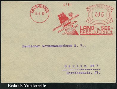 9120 | 16 € | 5000 KÖLN (Absender-Freistempel) : KÖLN-NIPPES/ ..DEHNUNGSKABEL/ ´LAND UND SEE´/ LAND-u.SEE-/ KABELWERKE AG 1930 (15.9.) AFS Francotyp "Bogenrechteck" (Seekabel, Logo) Bedarfs-Vorderseite (Dü.E-1CEh) | ![]() | |