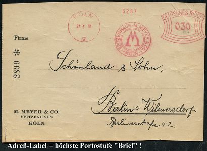 9122 | 25 € | 5000 KÖLN (Absender-Freistempel) : KÖLN/ 7/ SPITZENHAUS M. MEYER & Co.. 1931 (23.3.) AFS Francotyp "Bogenrechteck" 030 Pf. = höchste Gew.-Stufe "Brief" (Firmenlogo mit stilis. Dom) Adrep-Label: M. MEYER & CO., SPITZENHAUS.., = seltene Portostufe! (Dü.E-1CEh) | ![]() | |
