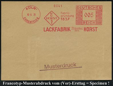 9124 | 35 € | 5000 KÖLN (Absender-Freistempel) : KÖLN-/ EHRENFELD 1/ HORST/ Fabrik-/ gründung/ 1837/ LACKFABRIK Theodor Jos. HORST 1931 (10.6.) AFS-Musterabdruck Francotyp "Mäanderrechteck" (Firmen-Logo) glasklar gest. Francotyp-Musterblatt vom (Vor)-Ersttag !, selten! (Dü.E-2CEh) | ![]() ![]() | |