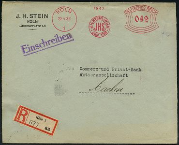 9133 | 28 € | 5000 KÖLN (Absender-Freistempel) : KÖLN/ 1/ J.H.STEIN,KÖLN/ JHS/ gegr.1790 1932 (22.4.) AFS Francotyp "Bogenrechteck" 042 Pf. + RZ: Köln 1/ a a , klar gest. Fern-R-Bf. n. Aachen, rs. AS. (Dü.E-1BAh) | ![]() | |