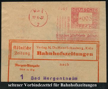 9135 | 25 € | 5000 KÖLN (Absender-Freistempel) : KÖLN/ 7/ MODERN/ AKTUELL/ AKTUELL/ Kölnische Jllustrierte Zeitung 1932 (17.6.) AFS Francotyp "Mäanderrechteck" 005 Pf. (etw. abgenutzt) auf (unten gering verkürztem) Vorbindezettel: Verlag M. DuMont Schauberg.. Kölnische Zeitung Bahnhofszeitungen = seltene Portostufe (Dü.E-2Ah) | ![]() | |