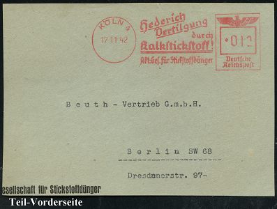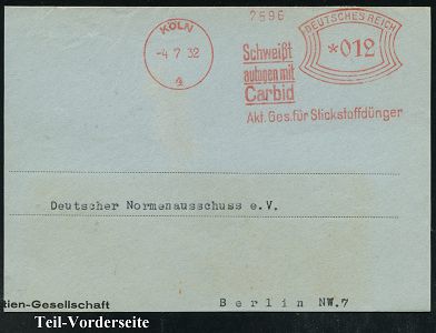9136 | 35 € | 5000 KÖLN (Absender-Freistempel) : KÖLN 4/ Akt.Ges.für Stickstoffdünger.. 1932/42 3 verschiedene AFS Francotyp "Bogenrechteck" (2x) bzw. "Reichsadler" mit div. Werbeklischees für Carbid (Schweißen), Kalk-Stickstoff u. Hederich Vertilgung.., je auf Teil-Vorderseite, 3 Belege (Dü.E-1Ah, E-5DGo) | ![]() ![]() | |