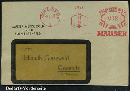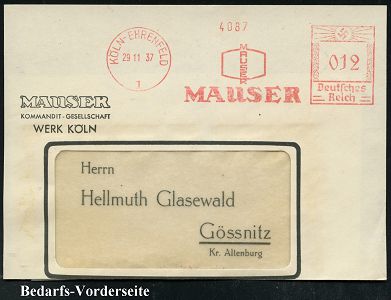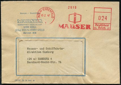 9137 | 25 € | 5000 KÖLN (Absender-Freistempel) : KÖLN-EHRENFELD/ 1/ MAUSER 1932/37 2 verschiedene AFS Francotyp "Bogenrechteck" bzw. "Hakenkreuz" (je Firmen-Logo) je auf Firmen-Vorderseite = berühmter Waffen-Hersteller, z. B. Karabiner "K98" und Pistole "C 96" (gegr. 1811 - 2004, heute Rheinmetall), 2 Belege (Dü.E-1CEh, E-3CEh) | ![]() ![]() | |