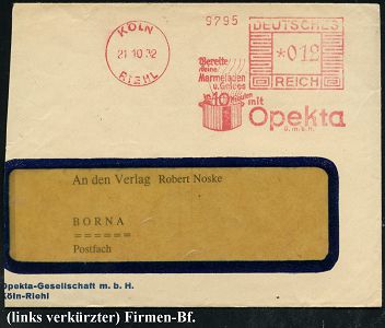 9138 | 20 € | 5000 KÖLN (Absender-Freistempel) : KÖLN/ RIEHL/ Bereite/ deine/ Marmelade/ u.Gelees/ 10 Minuten/ mit/ Opekta/ gmbH 1932 (21.10.) AFS Francotyp "Mäanderrechteck" (dampfender Kochtopf) links etw. verkürzter Firmen-Bf., der Vater von Anne Frank arbeitete für die Fa. Opekta (Dü.E-2Ah) | ![]() | |