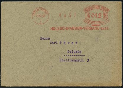 9139 | 18 € | 5000 KÖLN (Absender-Freistempel) : KÖLN (RHEIN)/ 1/ HOLZSCHRAUBEN-VERBAND GmbH 1932 (21.12.) AFS Francotyp "Bogenrechteck" , klar gest. Fern-Bf. (Dü.E-1BAm, große Zählnr.) | ![]() | |