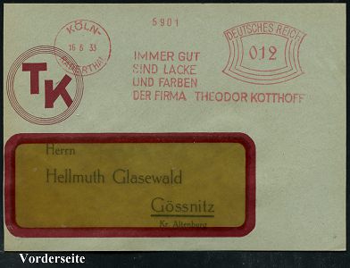 9141 | 30 € | 5000 KÖLN (Absender-Freistempel) : KÖLN-/ RADERTHAL/ ..LACKE/ UND FARBEN/ DER FIRMA THEODOR KOTTHOFF #bzw.# SPIES, HECKER & Co/ Lackfabrik.. 1933/37 3 verschiedene AFS Francotyp "Bogenrechteck" (2) bzw. "Hakenkreuz" , je klar gest. Bedarfs-Vorderseite, 3 Belege (Dü.E-1CEh (2x), E-3CEh) | ![]() ![]() ![]() | |