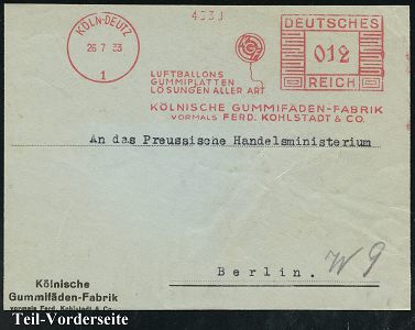 9142 | 18 € | 5000 KÖLN (Absender-Freistempel) : KÖLN-DEUTZ/ 1/ LUFTBALLONS/ GUMMIPLATTEN/ LÖSUNGEN ALLER ART/ KÖLNISCHE GUMMIFADEN-FABRIK... 1933 (26.7.) AFS Francotyp "Mäanderrechteck" (= Luftballon mit Firmen-Monogramm) Bedarfs-Vorderseite (Dü.E-2CAh) | ![]() | |