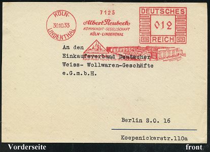9145 | 16 € | 5000 KÖLN (Absender-Freistempel) : KÖLN-/ LINDENTHAL/ Albert Neubeck/ KG../ Rheinland-Wolle/ Kunst Modell-Ateliers.. 1933 (30.10.) seltener AFS Francotyp "Mäanderrechteck" (Firmenlogo mit Kölner Dom, Wohnblock) Bedarfs-Vorderseite (Dü.E-2BAh) | ![]() | |